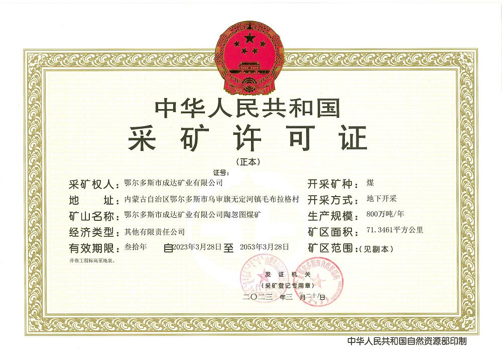 【喜訊】淮北礦業集團下屬成達公司陶忽圖煤礦獲得采礦許可證