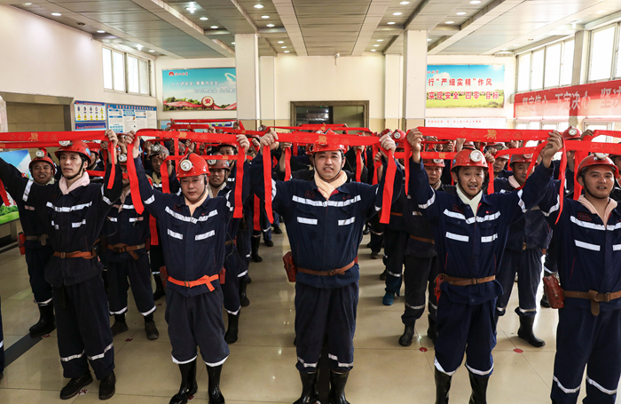 “安全生產(chǎn)月”中,桃園礦為每名礦工贈送了意寓著安全生產(chǎn)的紅腰帶,激發(fā)大家堅定安全“四零”目標(biāo)。(陳敏奎 攝)