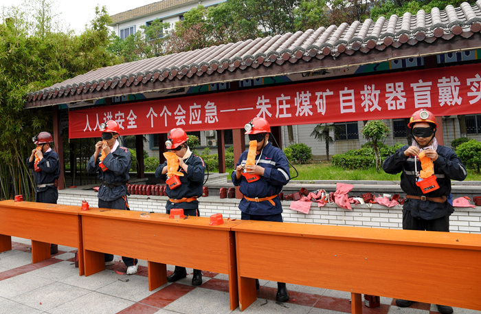 朱莊礦開展“自救器盲戴練兵”活動,確保職工遇到險情時能夠快速、準(zhǔn)確、安全地使用自救器(張宗風(fēng) 攝)
