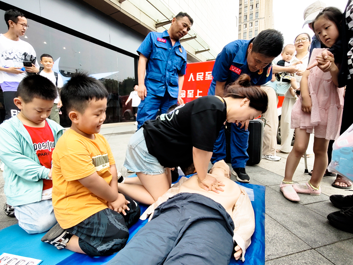 6月16日,救護(hù)大隊志愿者走到街頭,向市民講解、傳授急救知識,吸引眾多市民駐足觀看并參與。(吳加奇 攝)