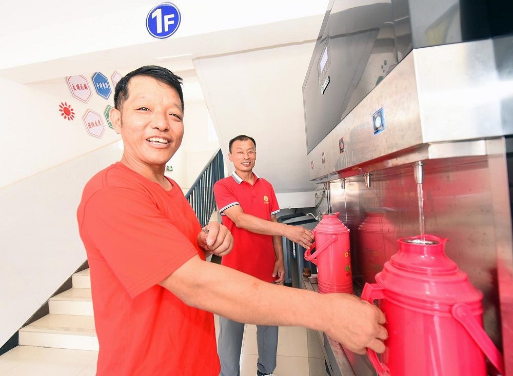 孫疃礦2名職工使用智能凈水機。(陳 更 攝)
