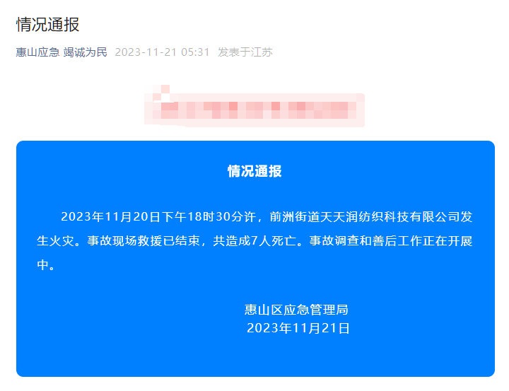 江蘇省無錫市一紡織廠11月20日晚間發生火災,事故造成7人死亡。據無錫市惠山區應急管理局發布的信息,惠山區前洲街道天天潤紡織科技有限公司11月20日18時30分許發生火災,事故共造成7人死亡。目前事故救援已經結束,善后工作已展開,事故原因正在調查中。另據惠山區委宣傳部提供的信息,事故中沒有發現其他受傷人員